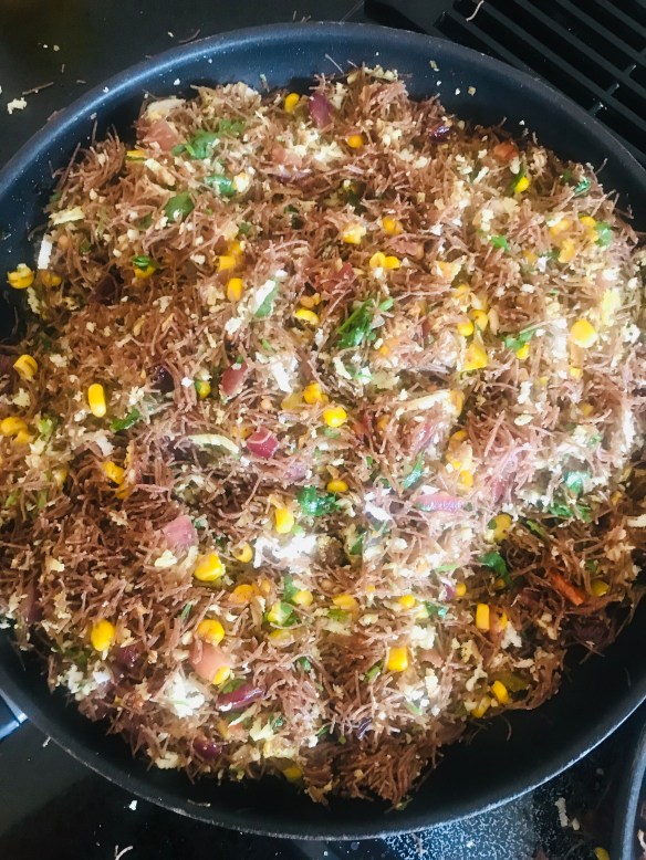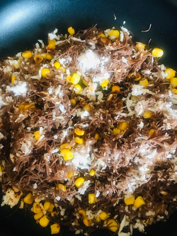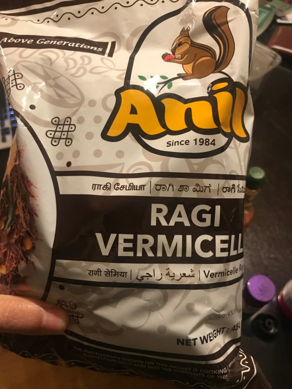 . Ragi is a millet, rich in calcium and gluten free (but don’t quote me on that). It is also easily available as flour and vermicelli in the Indian store and is delicious. It is important to prepare the ragi noodles according to the instructions on the packet to avoid the vermicelli clump from hell. This particular brand wanted me to soak the noodles for 3 minutes in salted water and steam for 5 minutes.