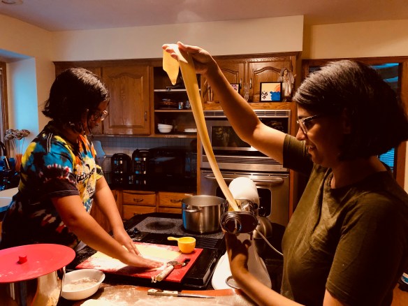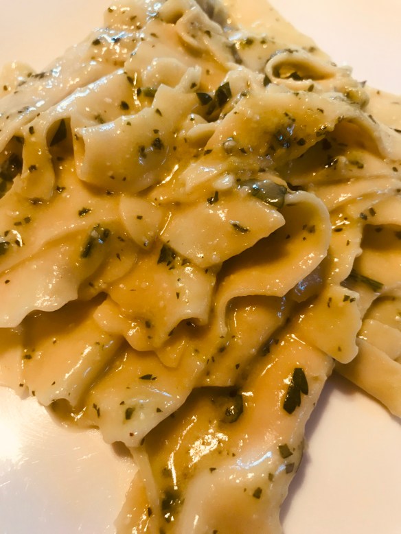 Nothing goes better with pesto than fresh pasta. Today we made handkerchief pasta (Fazzoletti) -simple,silky and delicious. It is essentially ravioli sheets cut into squares. My pasta machine makes this very very easy but here Mark Bittman shows how you can use a rolling pin to achieve the same effect (https://www.nytimes.com/2011/01/12/dining/12mini.html)