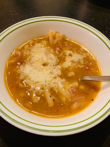 Broth: 1 tbsp of oil, add 7-8 cloves of garlic till they barely start getting color, add 1 small can of tomatoes (14 oz) blitzed through the blender with 4 cups of vegetable stock (I used better than boullion vegetable base). Add 1 tsp of dried thyme and 1 tsp of red pepper flakes. Bring to a boil and then simmer. Taste and adjust flavorings if needed- it should be delicious enough to drink as a brothy soup.