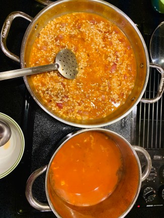I read a recent recipe for risotto with garlic broth, also I had some left over wine, which led to the development of this recipe. Adding flavor to the broth really appealed to me- so I decided to do a spicy tomato garlic broth- something delicious enough to drink as a soup and then make a risotto with it. I added some fire roasted corn – I used frozen (it is November in the mid west) but feel free to grill some corn and remove the kernels or regular boiled corn kernels would work as well but wihtout the smoky flavor that goes so well with the spicy broth. This is a superlative fall dish, the flavors are well developed and harmonious- a dish worthy of a thanksgiving table.
