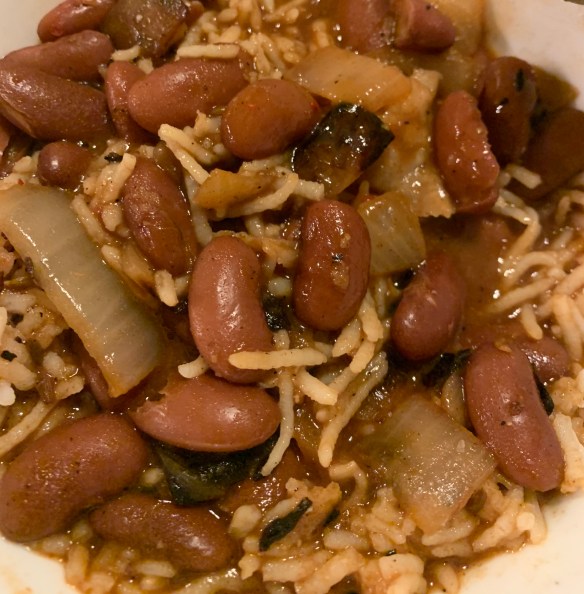 You have to use pressure cooked (I use my Cuisinart) red kidney beans for this one. The liquid is essential. You also have to pre-soak the beans – you can get the beans soft without soaking in the pressure cooker but they don’t taste anywhere as good.
