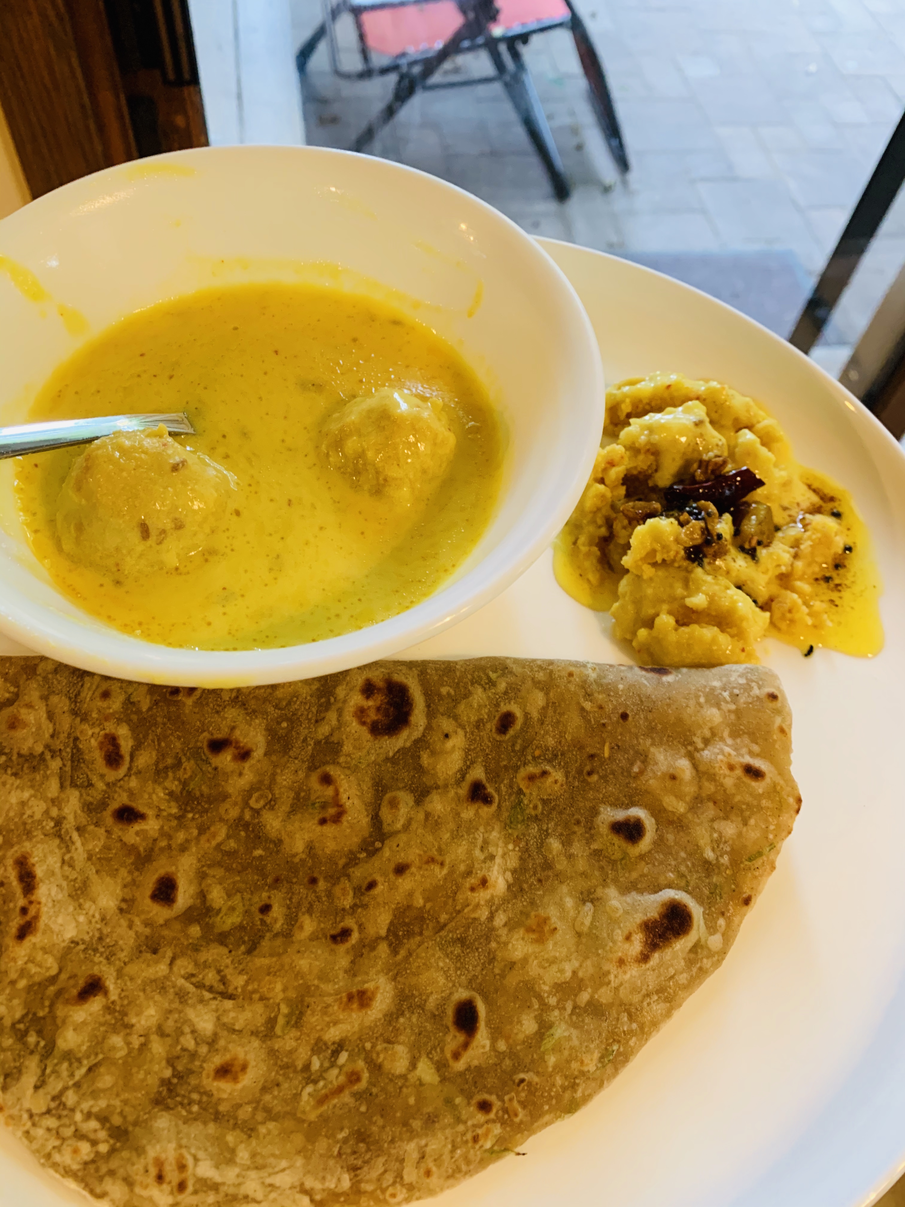 To eat with roti/parantha/naan or rice- take some kadhi in a bowl with 2-3 gole. Remove the dumplings on your plate and crush them, add the garlic chips in the flavored butter. The gole are eaten seperately from the kadhi.
