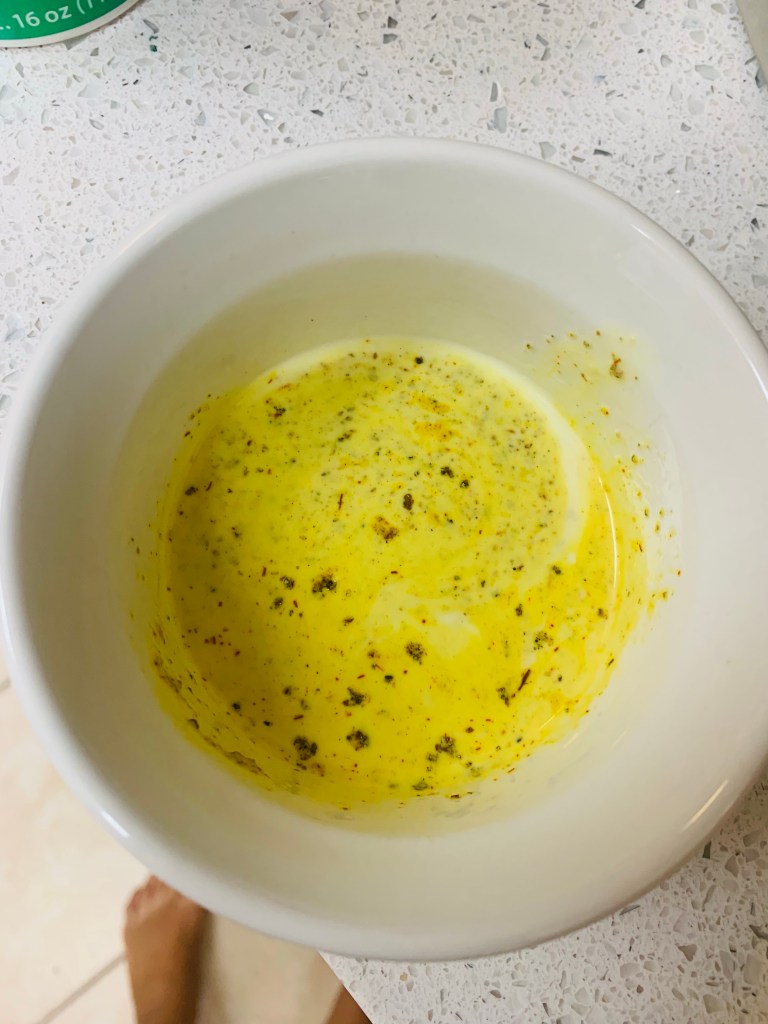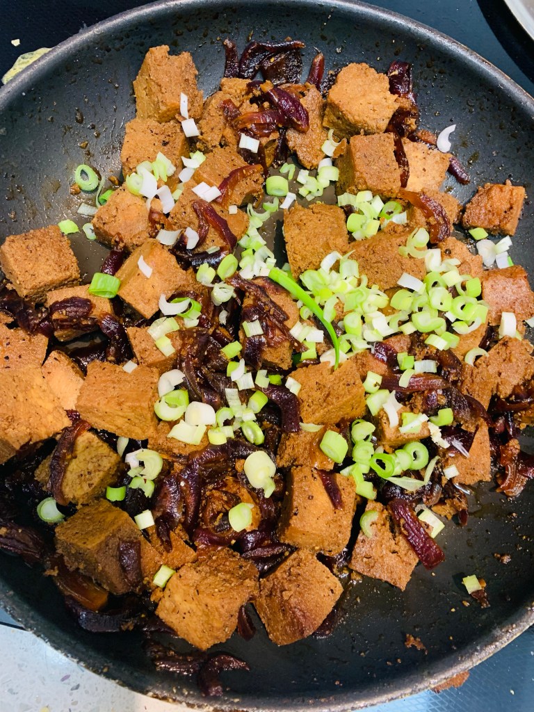 This is a recipe that works better with pressed tofu. Put a heavy weight on your tofu for 10-15 min. Today I had frozen tofu – just unfreeze and squeeze the water out like a sponge – the tofu has an entirely different texture, it’s quite delicious.