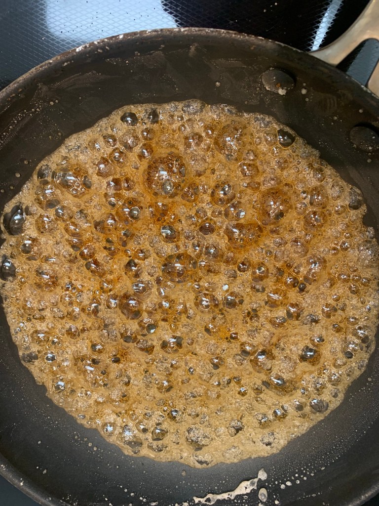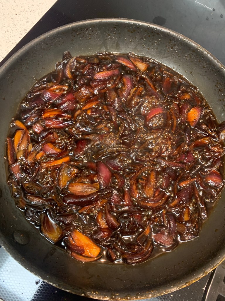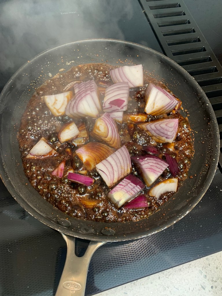 Caramelize 1/2 cup of sugar. I always start with a little water and a non stick pan and I swirl the caramel around. In this recipe – it’s important to go towards the slightly burnt end of the caramel- so wait till you can just start to smell the caramel. Immediately add the soy sauce (protect your hand from splatters- the caramel will cause severe burns) and the onion. Cook for 10 min on low. I added a little extra water here.