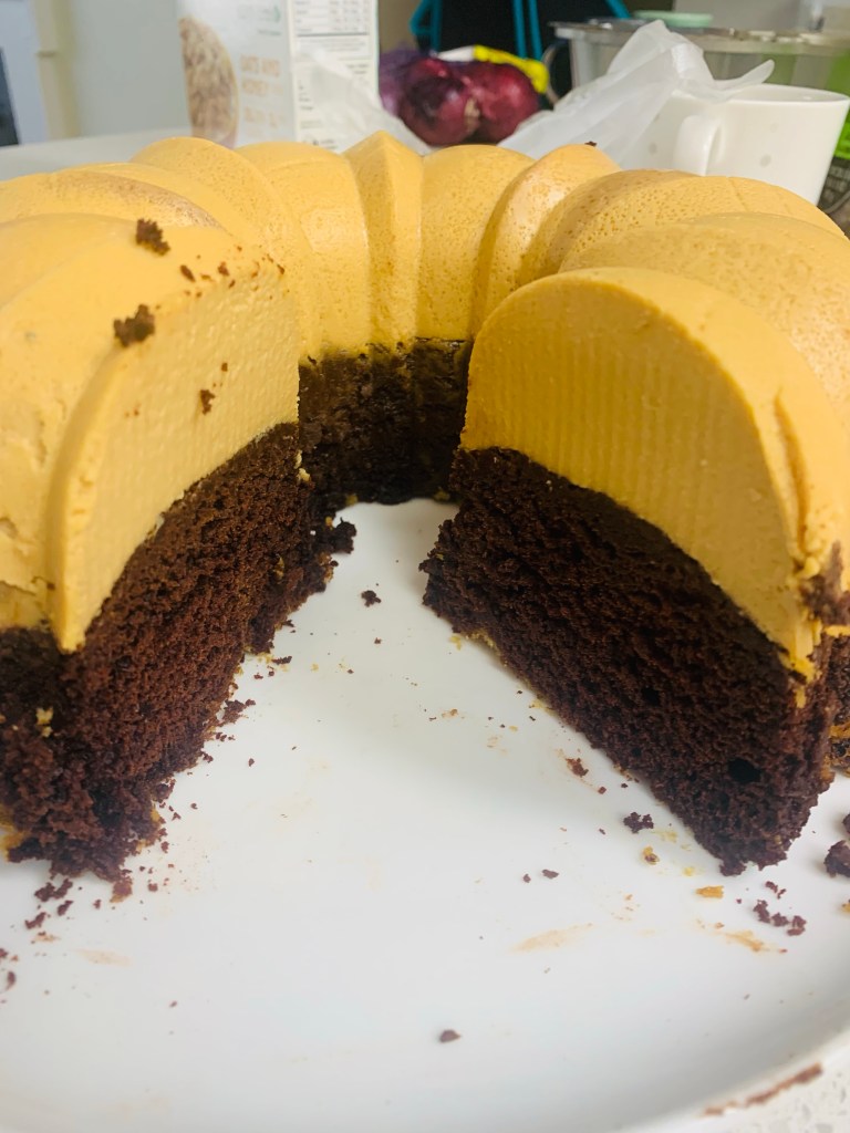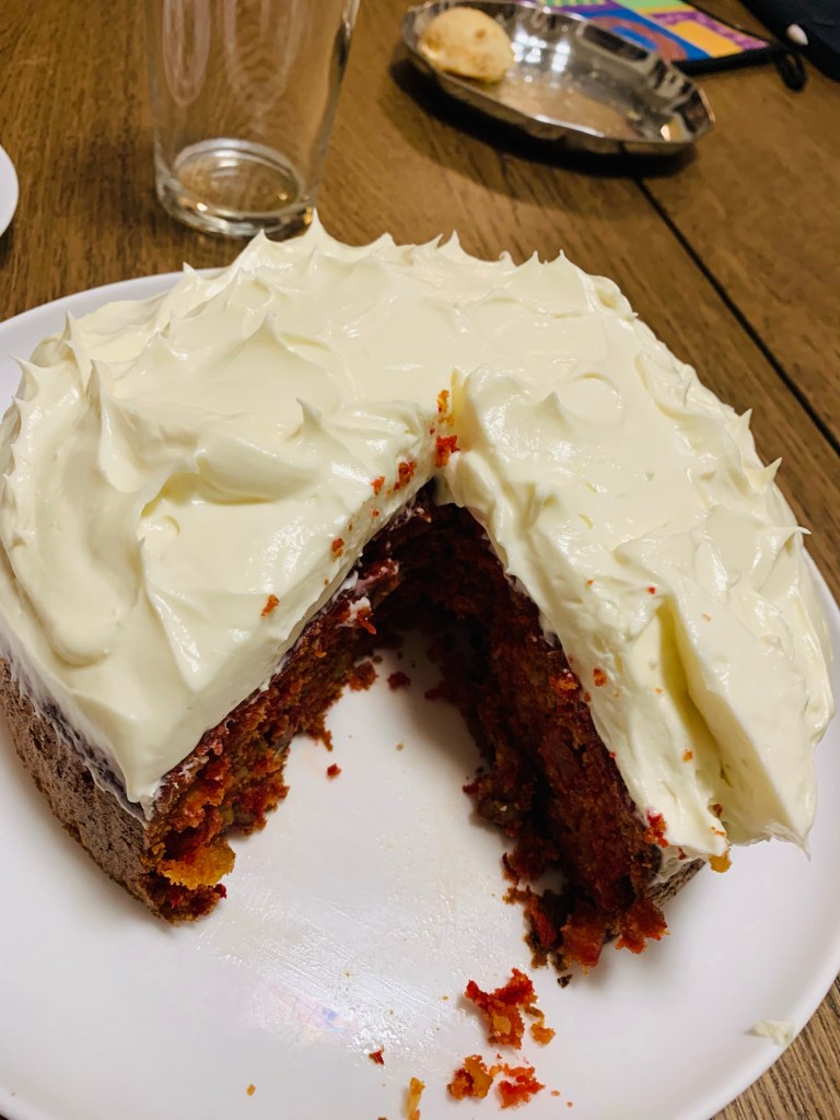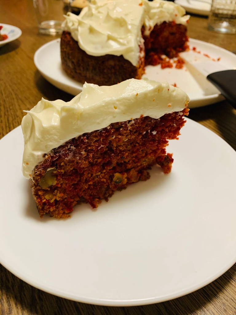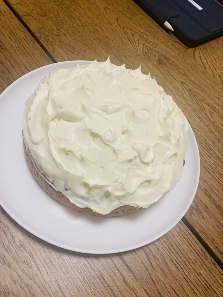 Frosting- 160 g cream cheese , 1/2 c confectioners sugar, 1/3 c heavy cream and juice from finely grated 2 inch ginger piece- add all together to a stand mixer with a paddle attachment and beat on medium for 4-5 minutes till light and fluffy. Spread on cake
