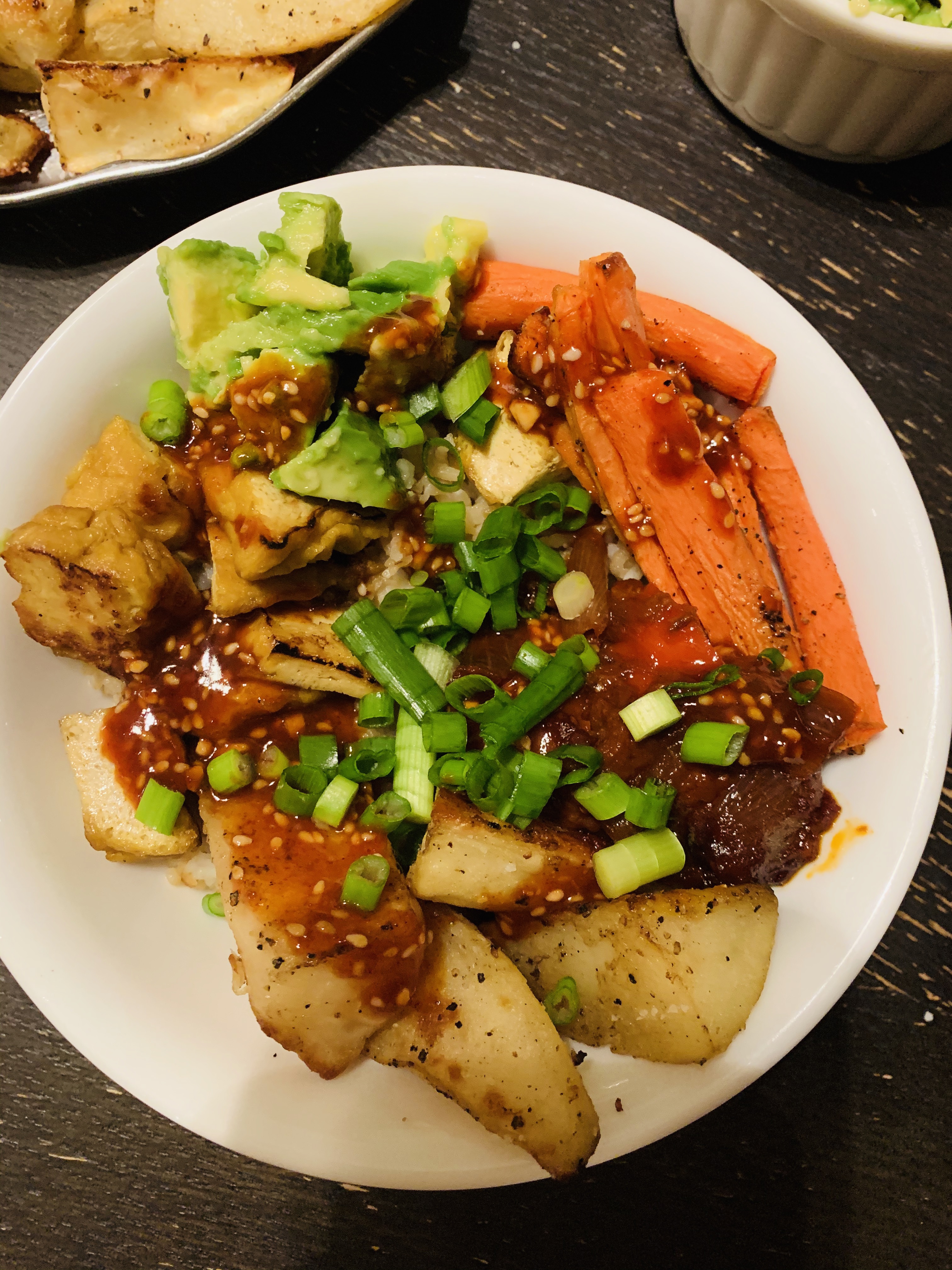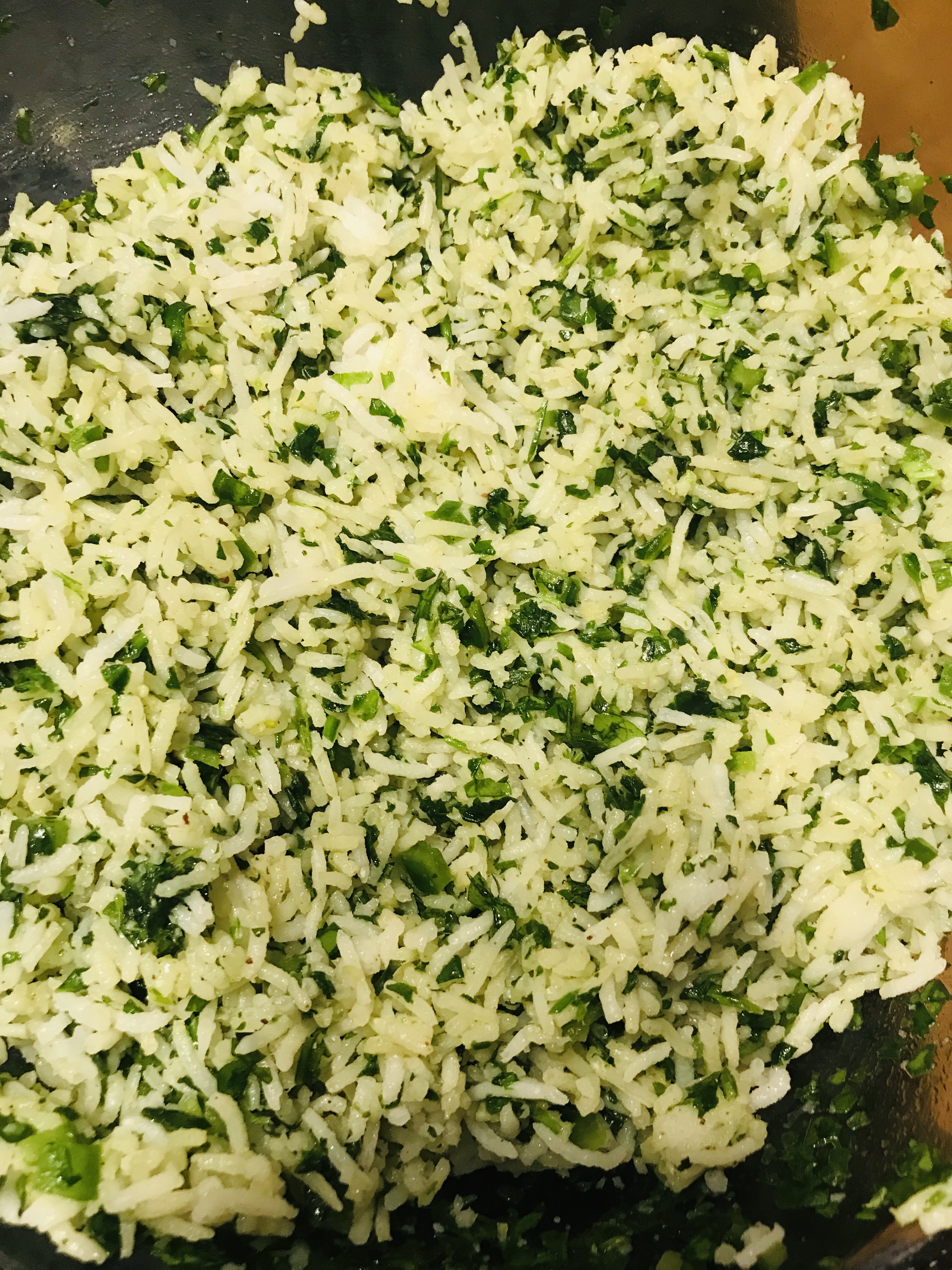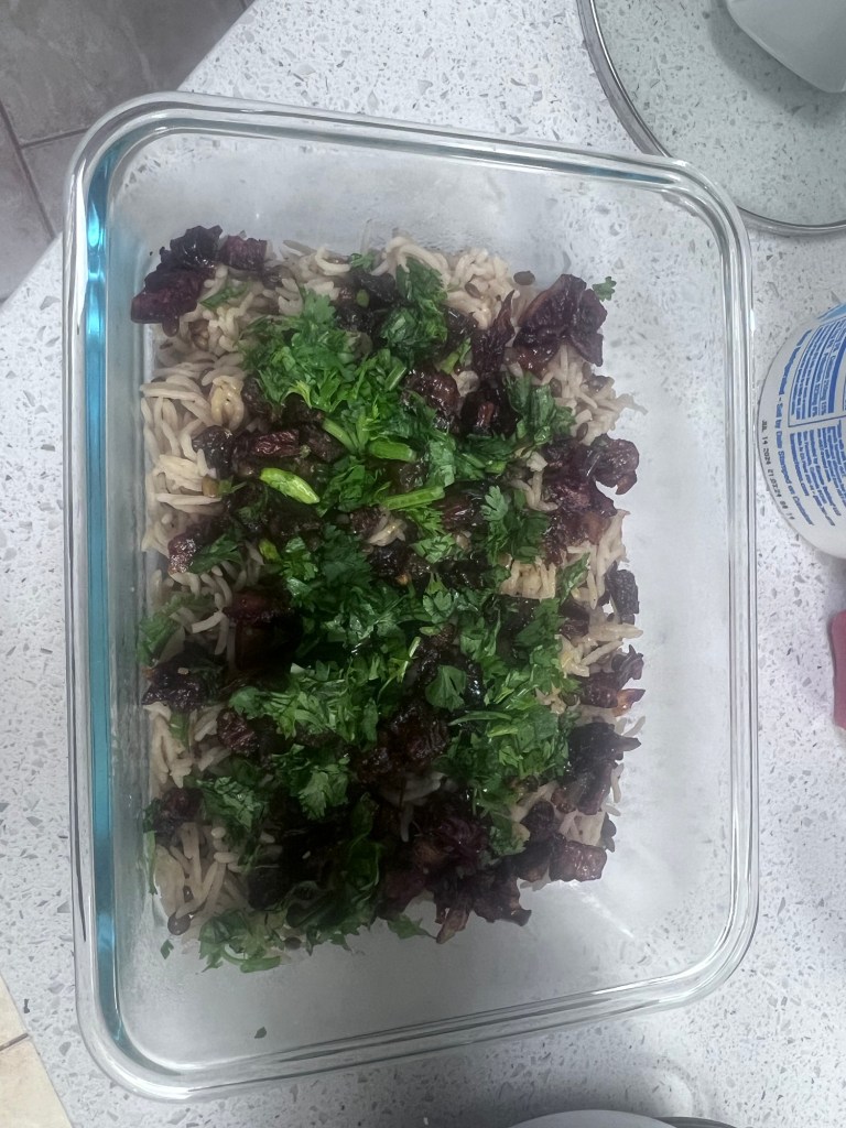 Now layer the rice with the onion-date-herb mixture. Drizzle with ghee (browned butter). Enjoy with salted yogurt on the side. This dish would be great covered with foil and heated just before serving.