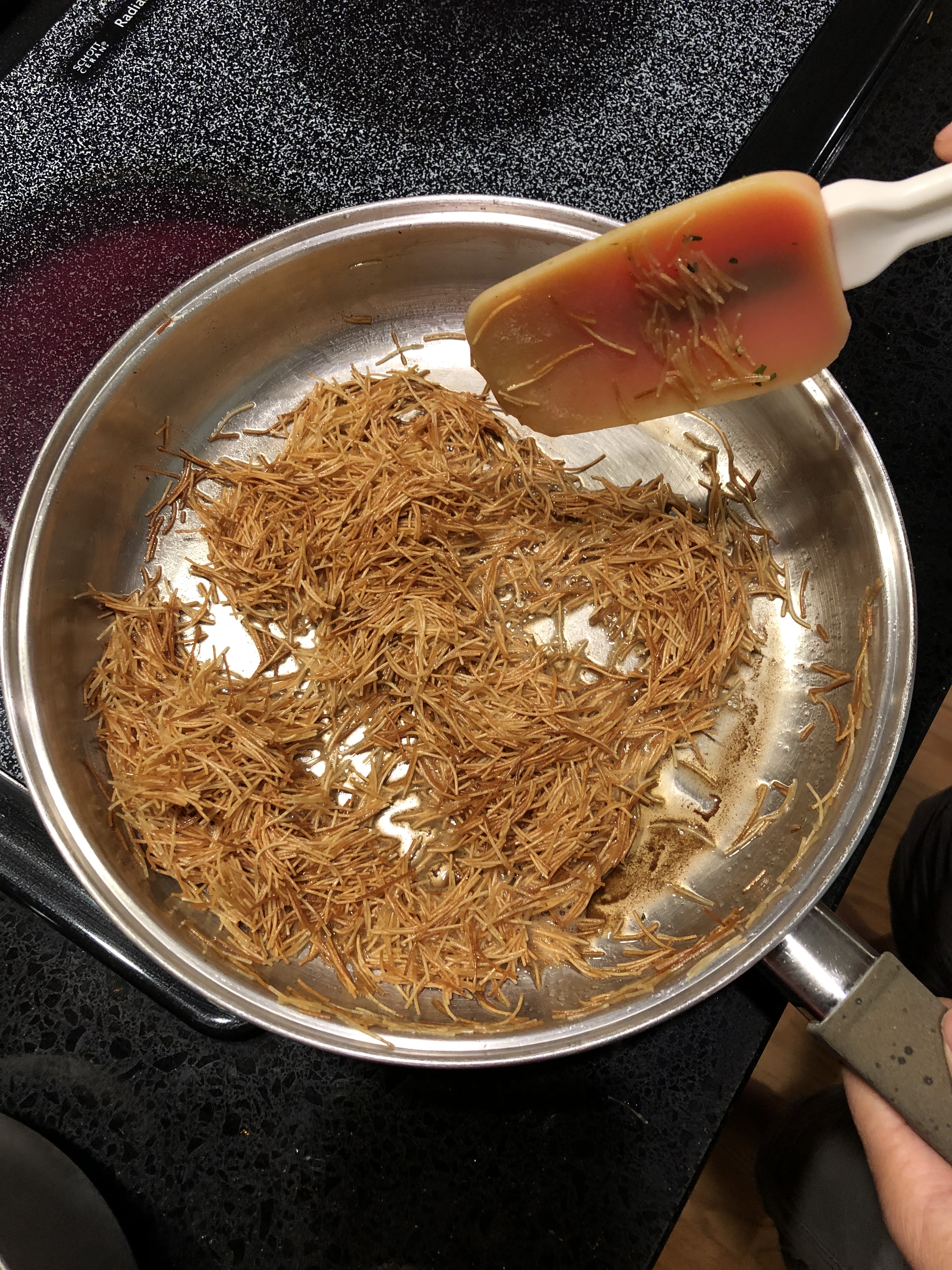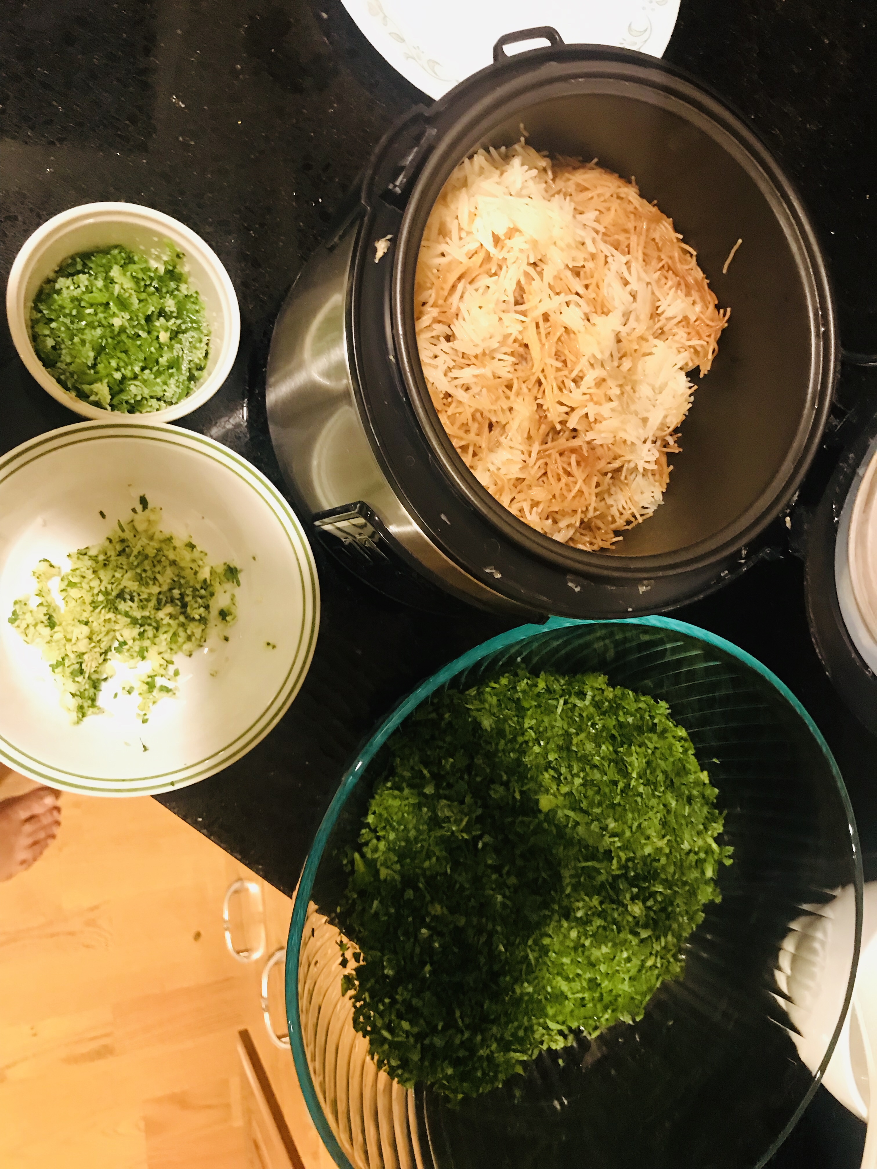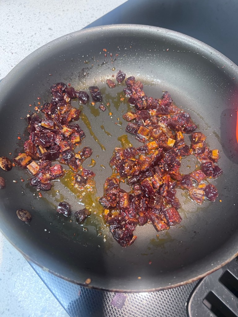 In a pan, heat some oil and fry up one large onion with some salt and pepper till it’s dark brown and a little crispy. This will take about 15 minutes. Make sure it doesn’t burn. Remove onion and in the same oil, fry up 6-7 chopped dates in the oil with some salt and I added Aleppo pepper (about a teaspoon). Next chop up a handful of herbs (mint, cilantro, parsley). Mix all that up