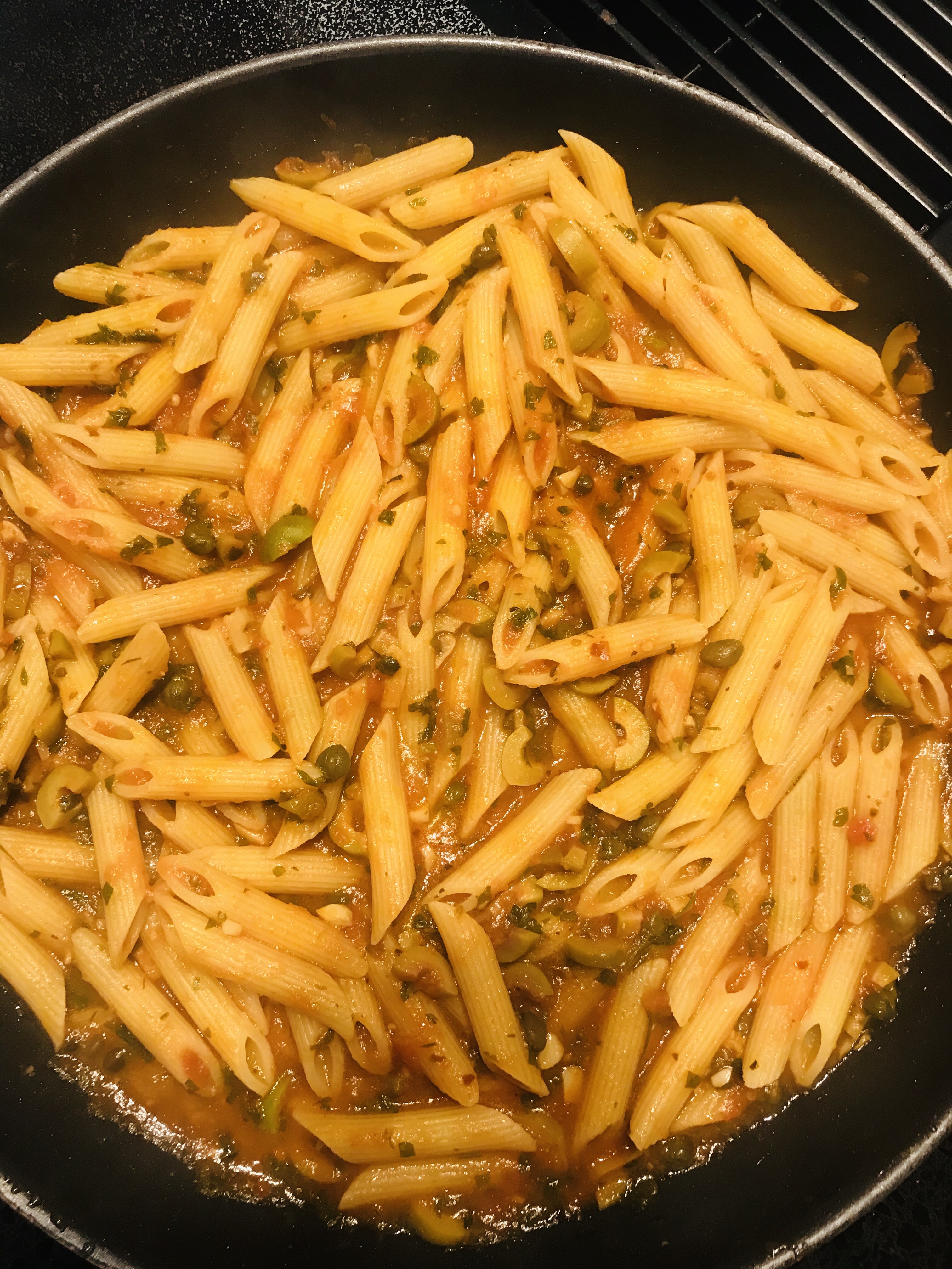 Heat the oil, add the garlic and cook for 1-2 minutes (don’t brown). Add the capers and olives and cook for another minute. Add the tomatoes and the oregano and the red pepper flakes. Cover the sauce and cook this low and slow for 20-30 minutes.