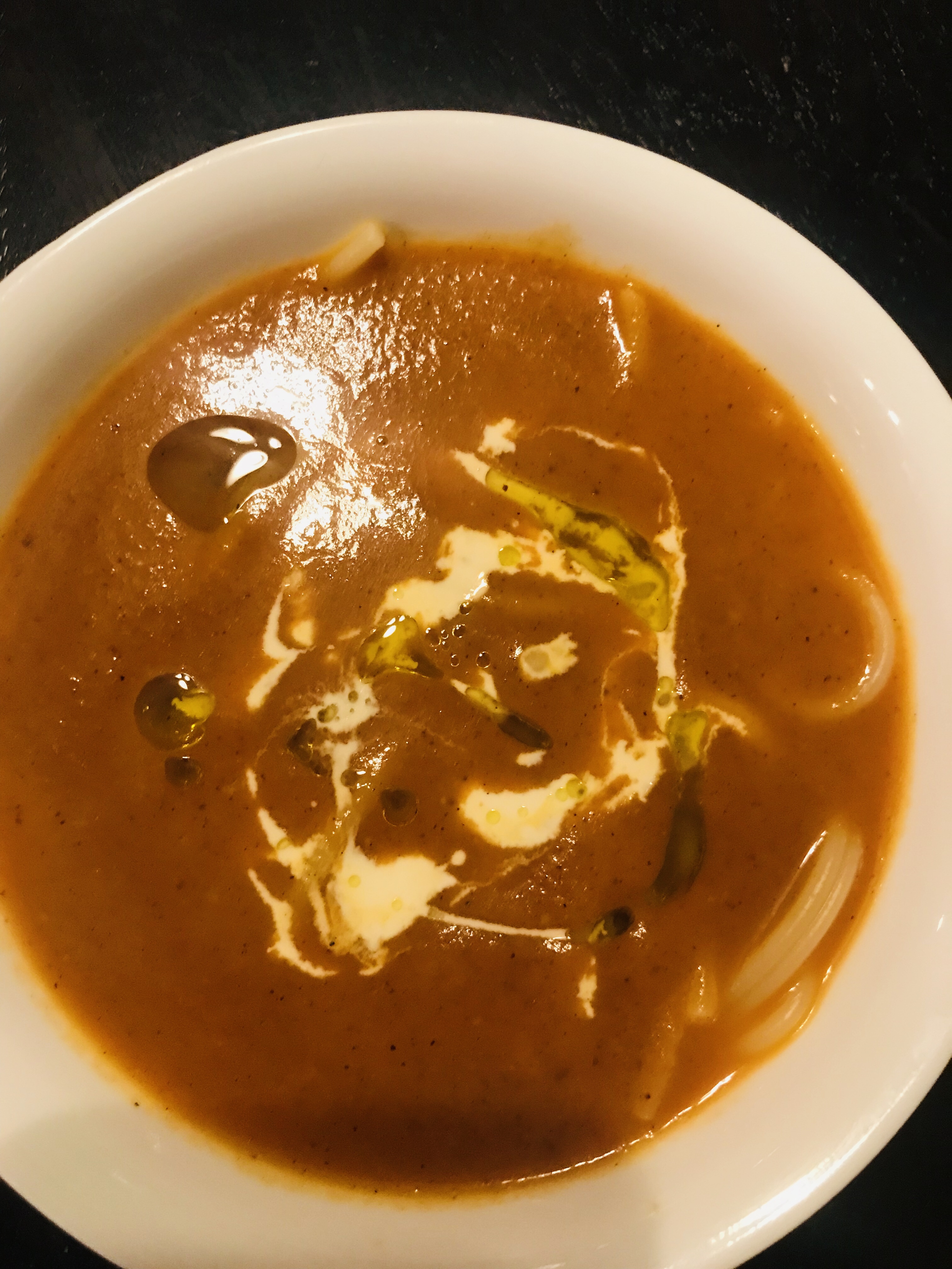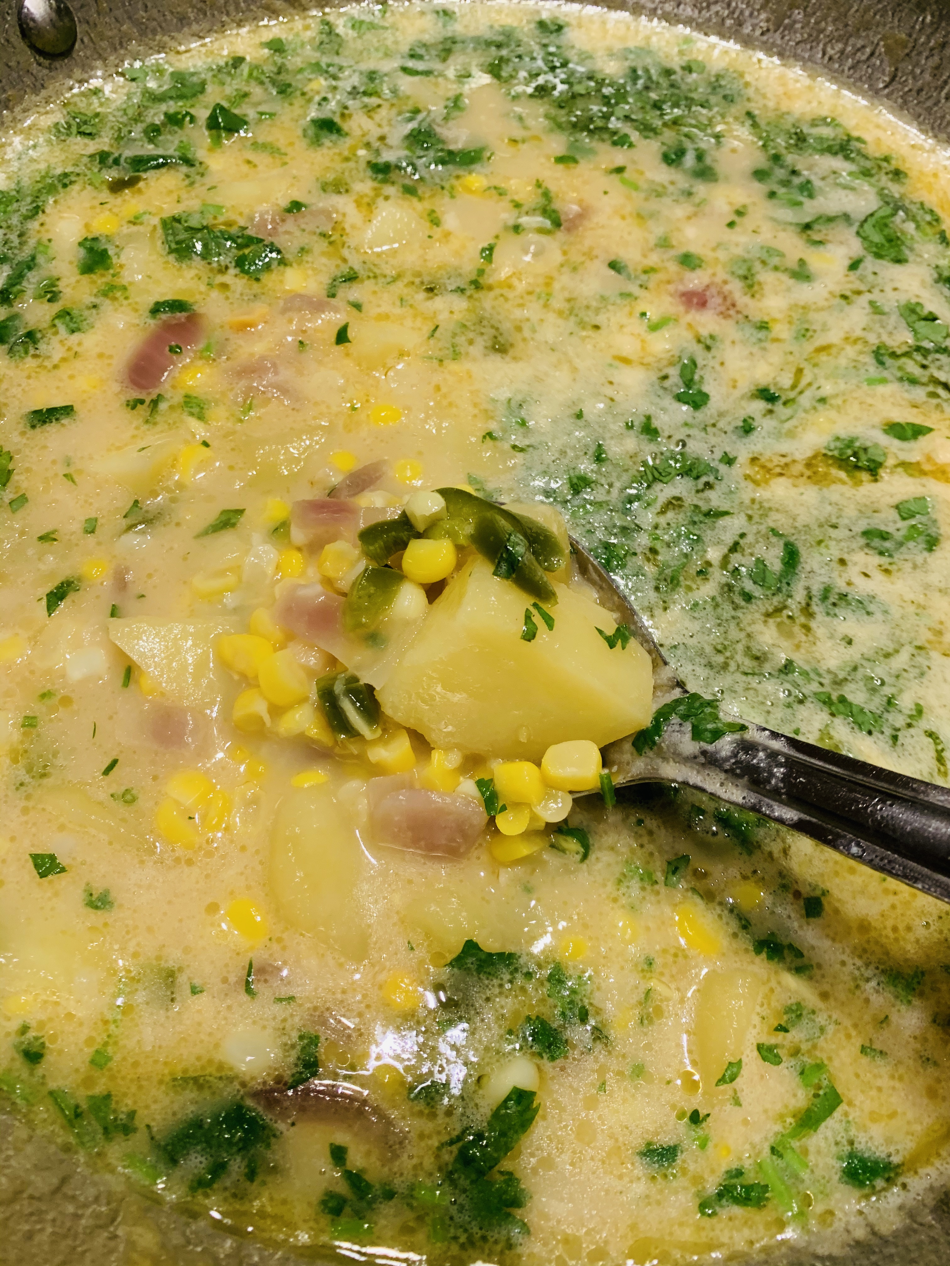 Remove kernels from 5 corn cobs. With all due respect to Alton, this unitasker is essential in my kitchen. I love this corn stripper. In a large pot, add 2 tbsp of butter and about half a cup of finely diced red onion. Cook gently till the onions are golden brown and very soft (about 10-15 min). Add 1 tbsp of grated ginger and 1 tbsp of finely chopped garlic and 1 finely chopped jalapeno. Cook for 30 seconds. Add 2 large russet potatoes diced into inch dices (about 2 cups). Add 4 cups of vegetable broth ( I use better than bouillon). Boil for 10 minutes till potatoes are tender. Add 1 15 oz can of full fat coconut milk and add the corn kernels and boil for another 5 minutes or so.