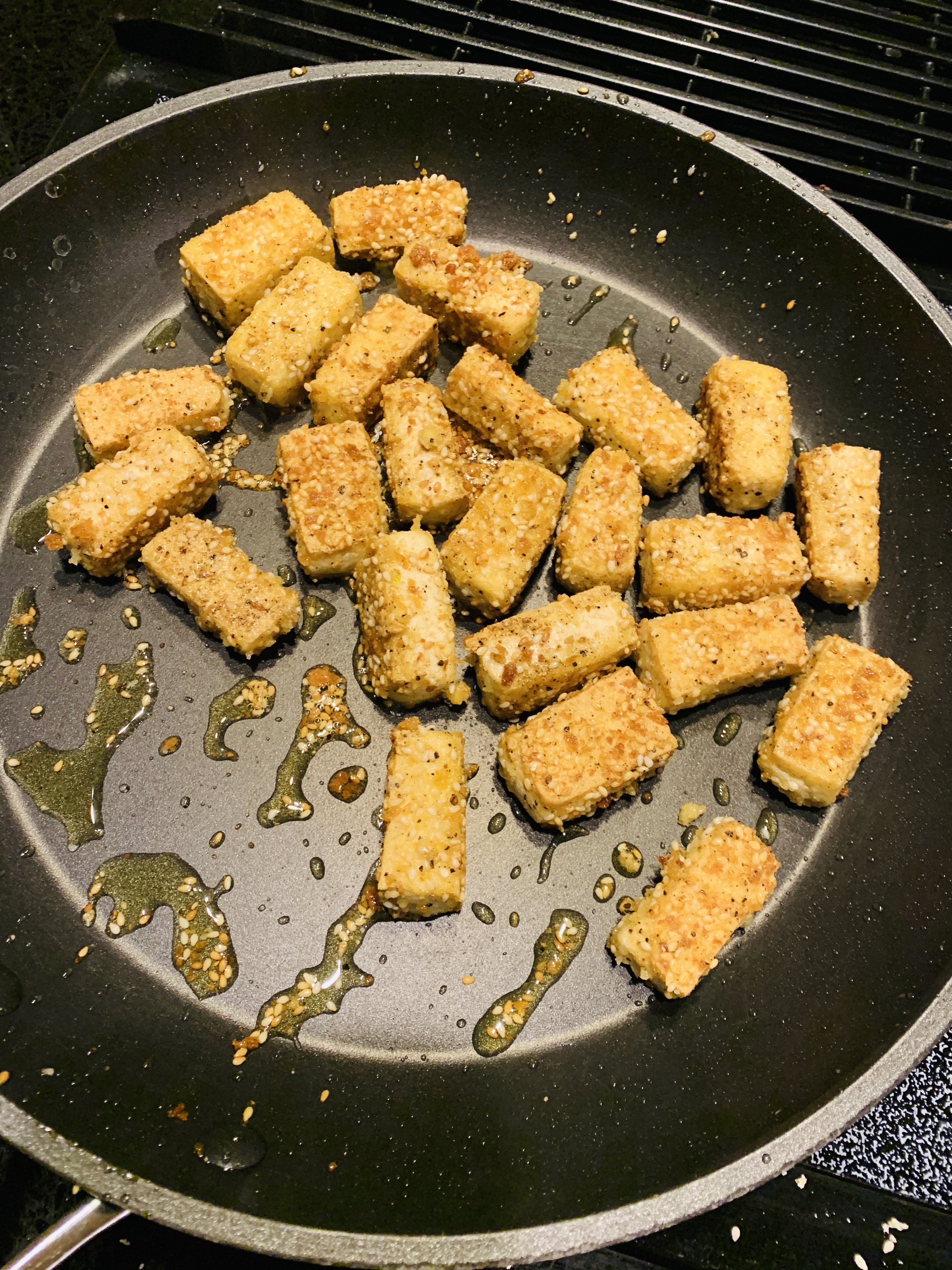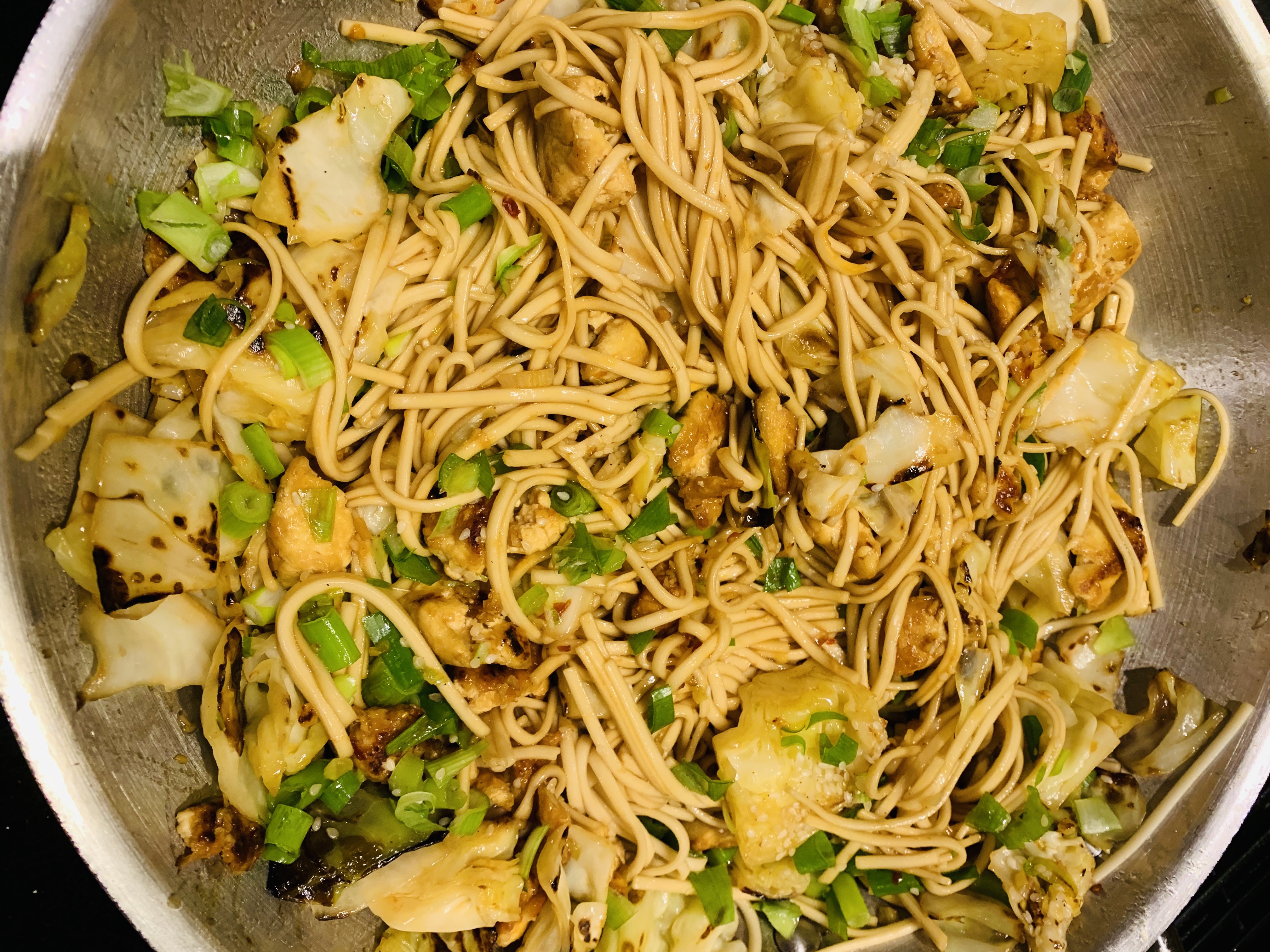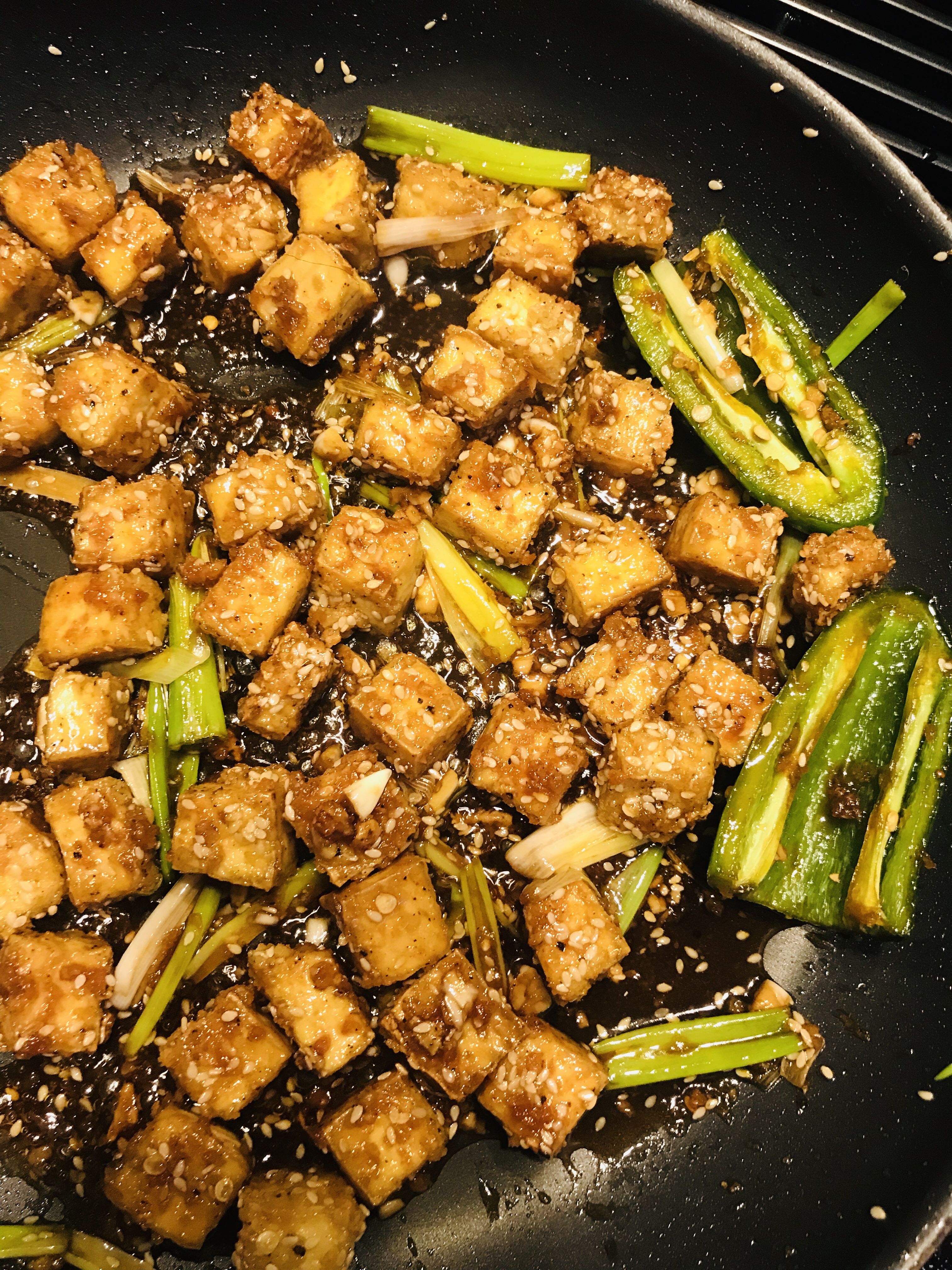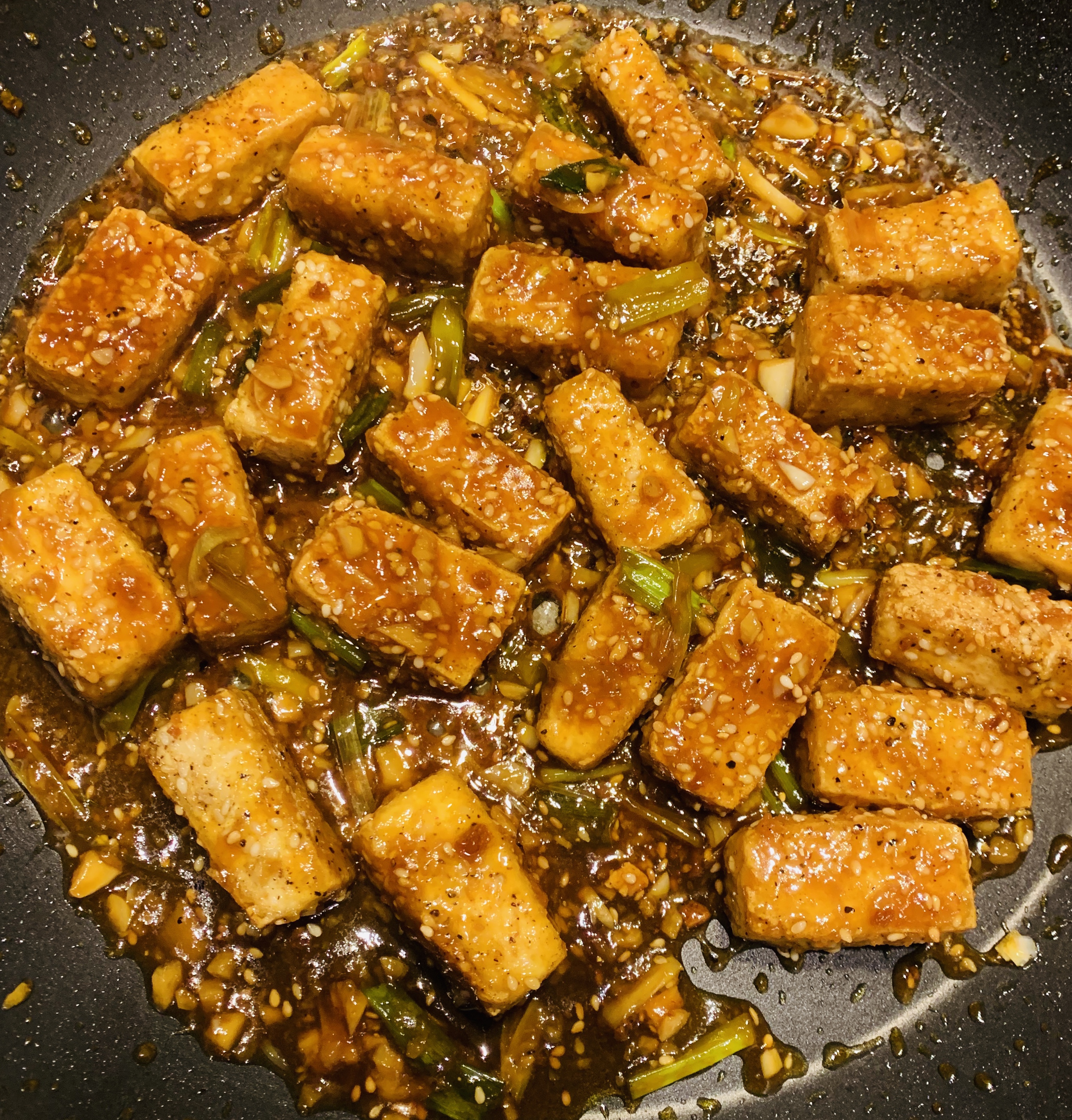 Make a hole in the center, add the flavorings. Cook for 30 sec and then toss with tofu