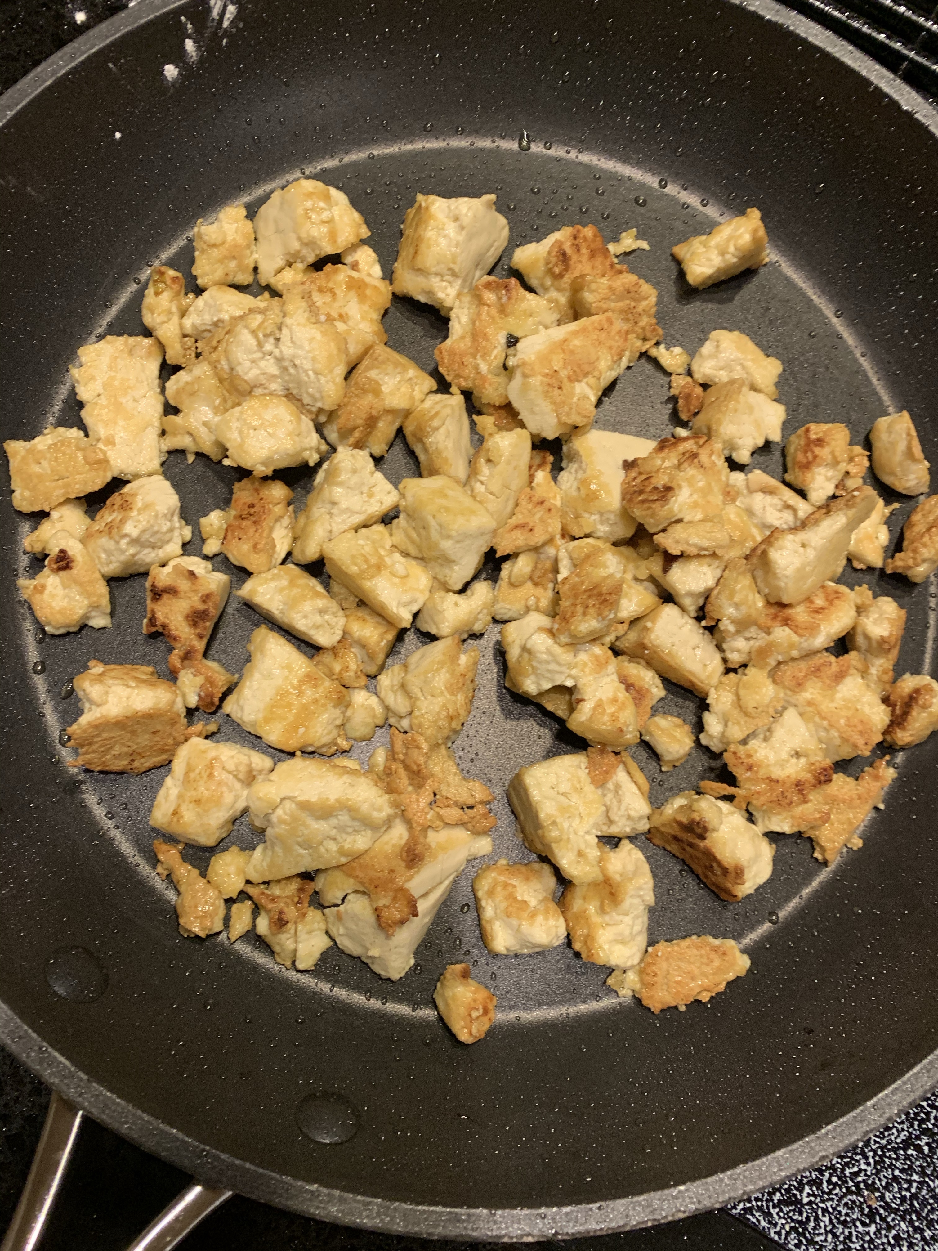In the same pan, add 1 tbsp vegetable oil and add the crumbled tofu with 1 tbsp corn starch just shaken over it. Cook over high heat till tofu is browned