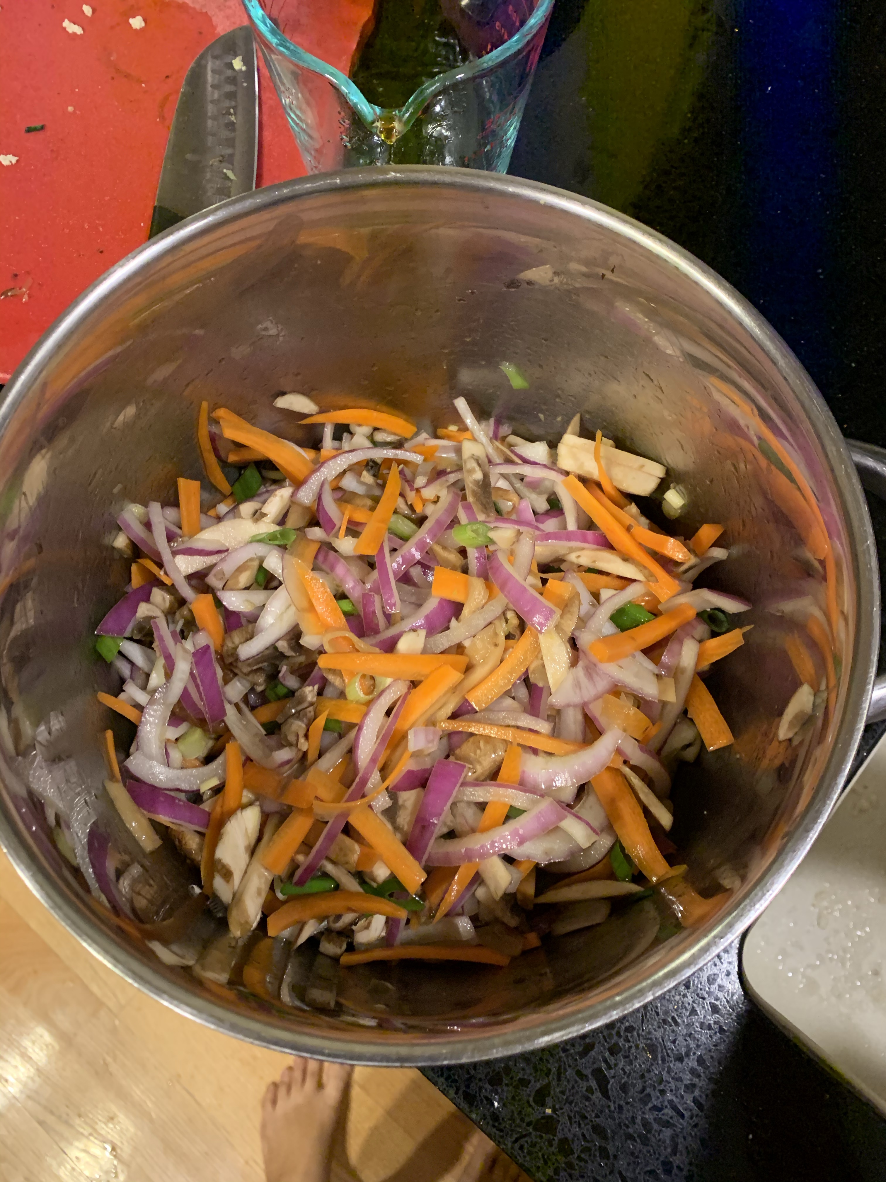 I tackle the stir fry prep first divided into veggies, protein, flavorings and garnish. This recipe is inspired from a Bon Appétit article