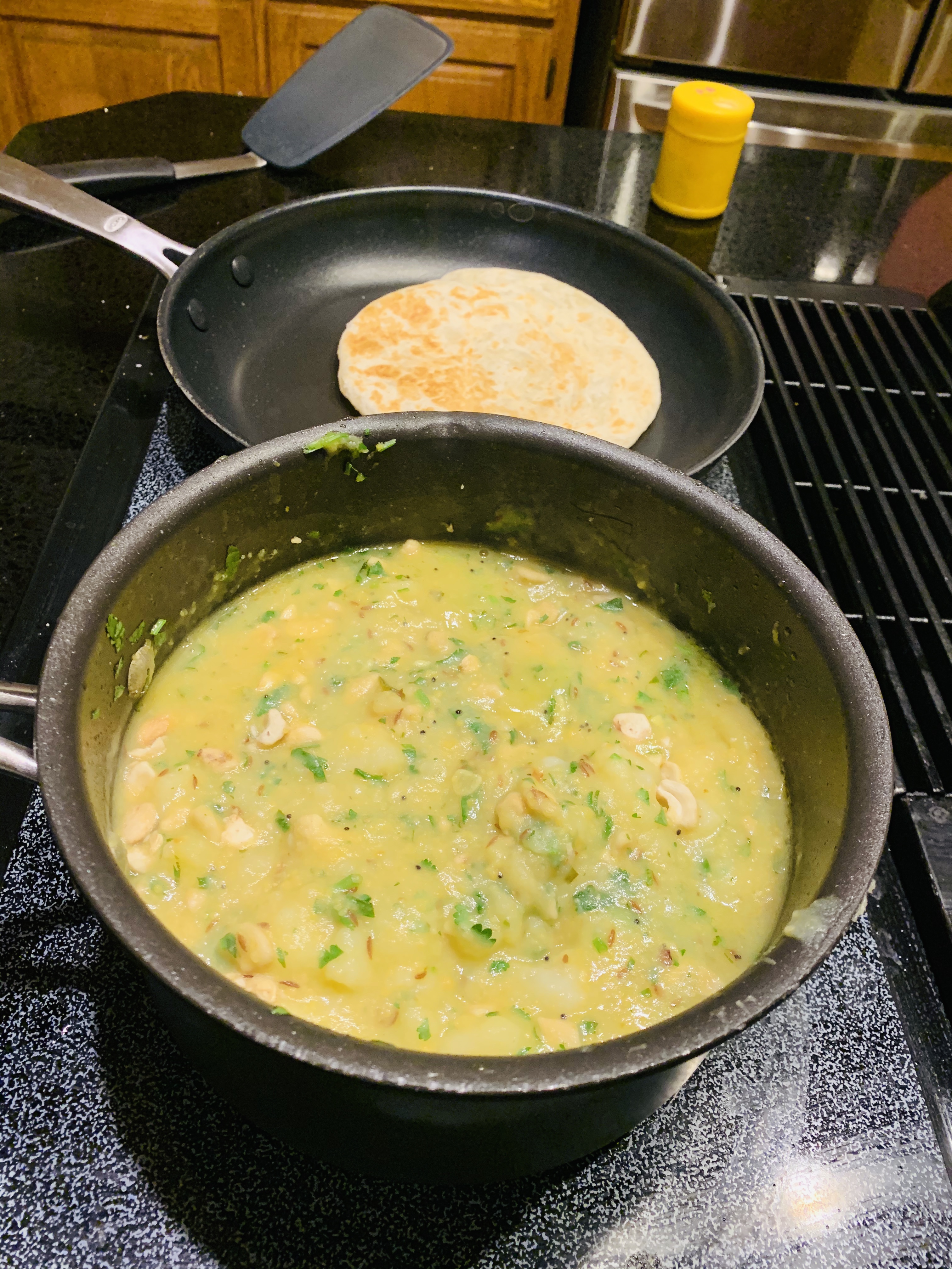 Step 4: add chana dal slurry and boil for 5-10 minutes. Remove off heat. Adjust salt, squeeze a lemon to taste and garnish with cilantro and roasted cashews.
