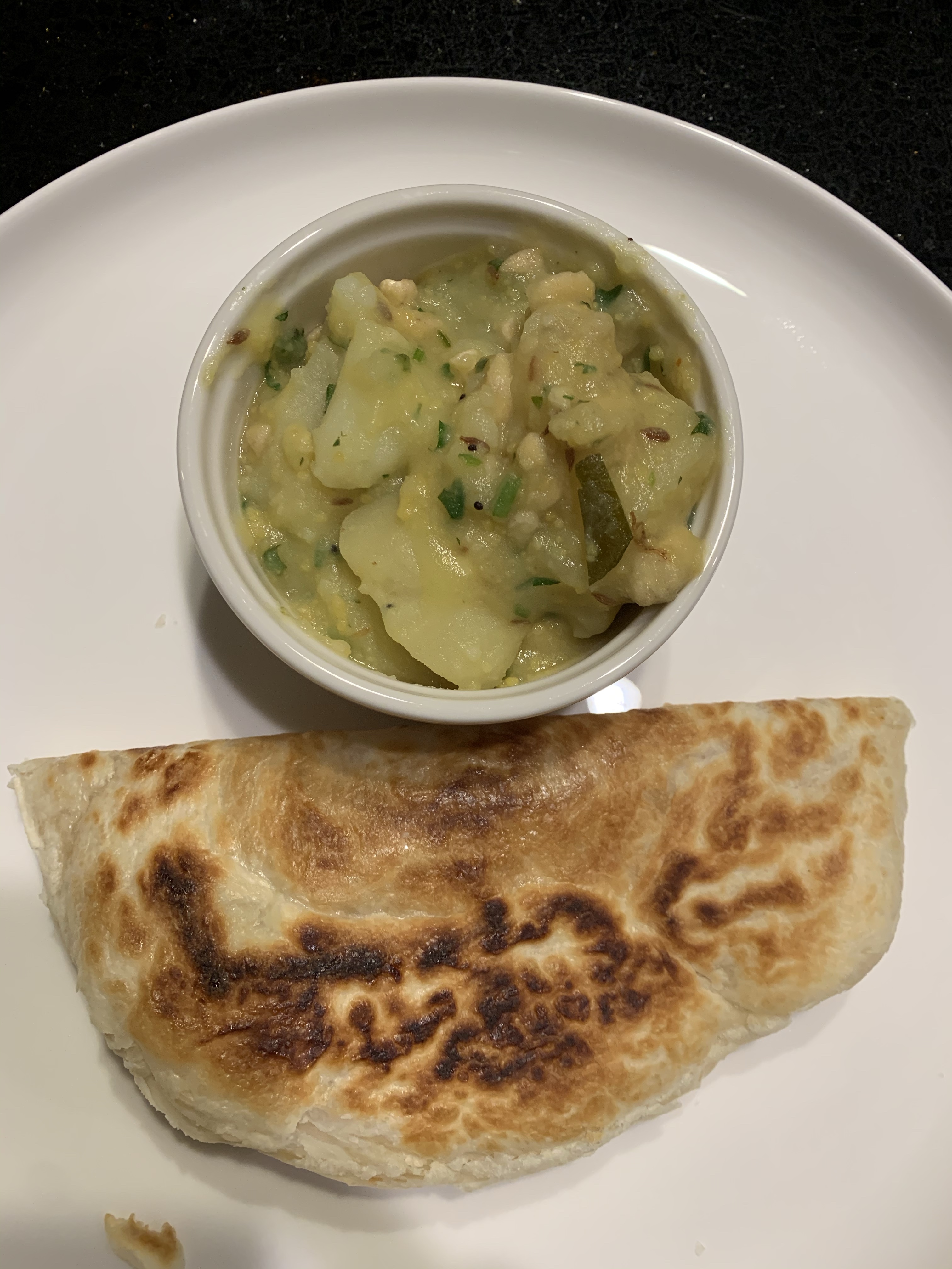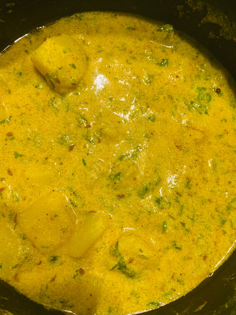 I’ve been on a quest for years for the perfect sagu recipe – the kind served with rava idli and ghee at the udupi restaurant in Bangalore. I think this might be it. The trick is to thicken the potato curry with ground roasted chana dal – it’s delicious with rice, dosa, roti or Malaysian parantha (a store bought treat – sadly too unhealthy for daily eats)
