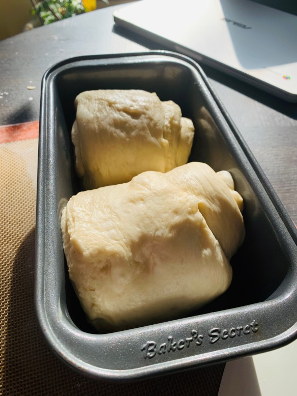 Shaping dough: take dough out onto a large floured area on your countertop ( I use a very large silpat on my countertop for this). Shape into a 24×4 inch rectangle. Now divide the dough using your benchscraper lenghtwise to get 2 rectanges 24×2 inches in size. Start rolling the 2 dough strips into tight spirals and place both side by side into a greased 8.5×4.5 inch loaf pan. Cover with cling film and proof for 1/2-1 hour till the bread rises to the lip of the pan.