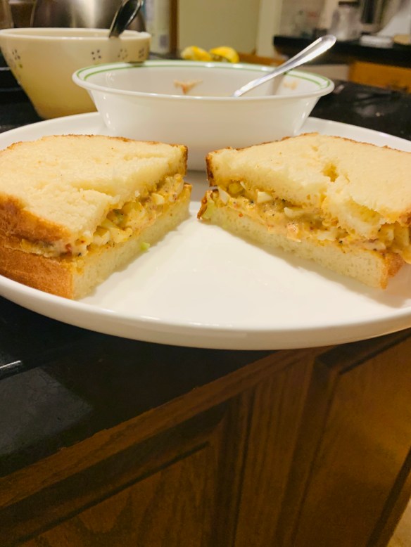 This recipe is in 2 parts- part one is the egg salad and part 2 is the bread. I have no idea if any of this tasted like the real thing but it was pretty tasty to us.