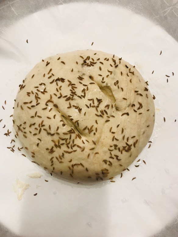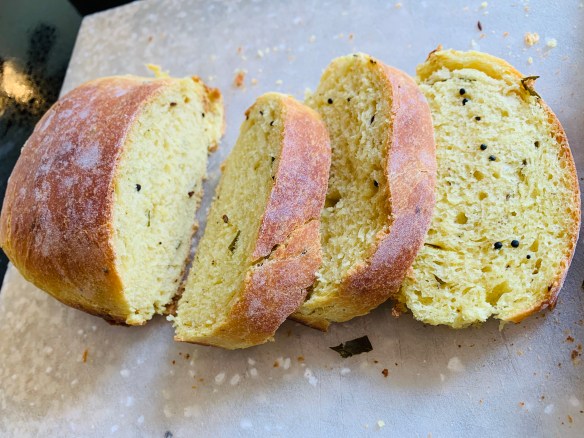 Flavor in Indian cooking comes from the tadka, when oil is infused with dried spices. This oil carries the flavor to the vegetables, dals, rice. This masala bread uses the same technique. The flavor really comes through and the bread is a lovely bright yellow. This is delicious with regular tomato soup and in a grilled cheese sandwich. I’ve modified my favorite bread recipe (Olive oil dough) in my favorite baking book- the New Artisan Bread in Five Minutes a Day. If you want to understand bread, I’d suggest you start with this book. Here is how I made this bread.