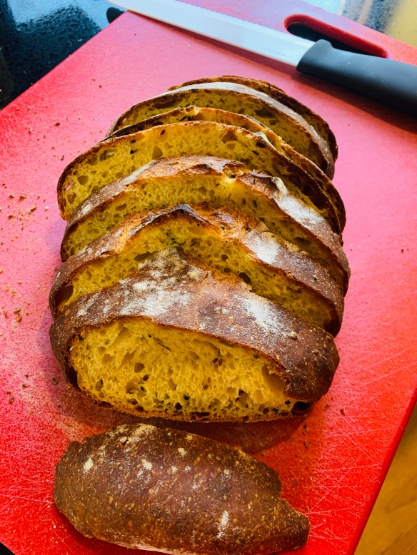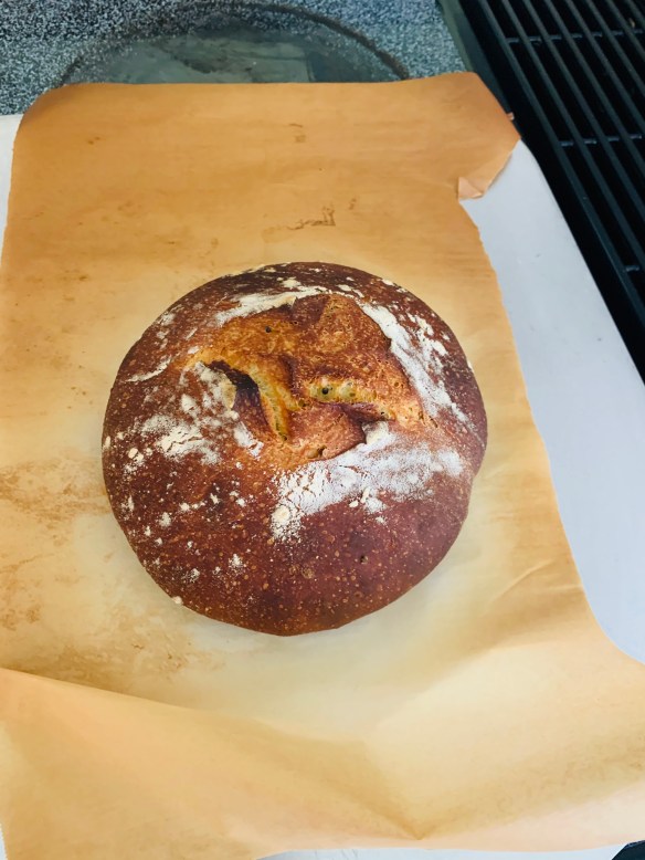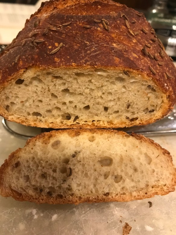 Step 6: Bake in a 450 F oven with steam. I use a dutch oven or a cloche to do this covered for 15 minutes and then remove the cover for the last 10 minutes. Cool the bread for at least 2 hours before slicing.